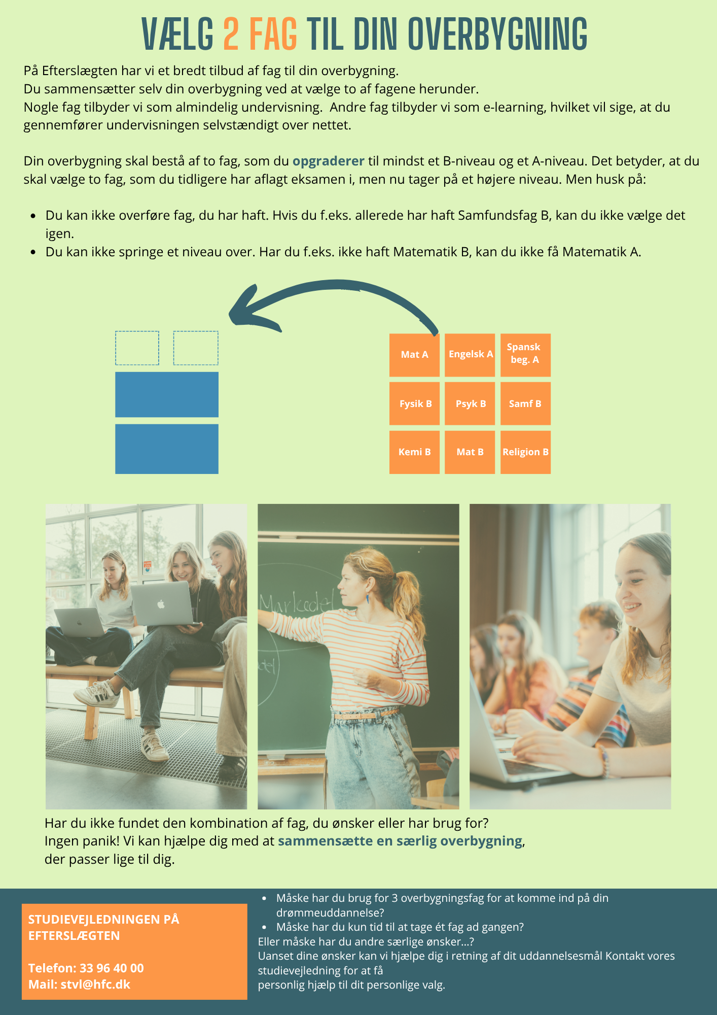 Tilmeld dig gratis til overbygningen ved at kontakte vores studievejledning, enten via mail eller telefon.